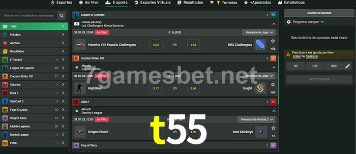 O t55 oferece uma grande seleção de opções de apostas em e-sports com probabilidades competitivas